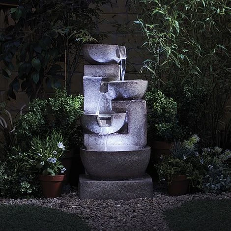 This four tier Laguna cascade water feature is perfect for creating an impressive focal point in your courtyard, garden or conservatory. There are four different levels, each with its own stone effect bowl that it is illuminated by three LED lights, allowing you to enjoy it at any time of the day or night.