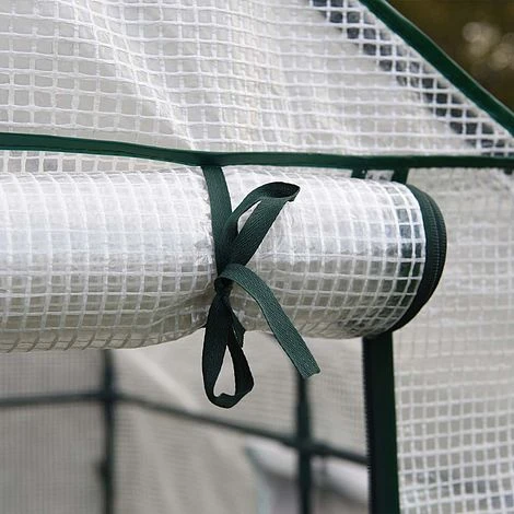 The frame is easy to put together and made from powder coated steel, that is durable and rust resistant. A waterproof plastic PE cover then goes over the top, and attaches to the frame. To help keep the greenhouse secure to the ground it is supplied with high-quality, durable, metal pegs. The cover has double stitched seams for maximum durability and a double zip door that can be rolled up for easy access, and to aerate the greenhouse on hot summer days.