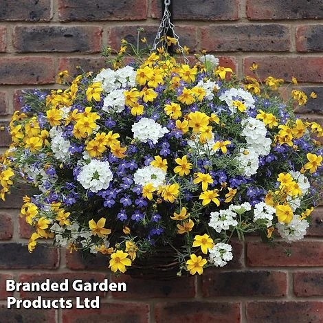 This remarkable combination is created by propagating three trailing annuals into 1 plug cell. The three varieties – deep blue lobelia, bright yellow bidens and crisp white verbena – are grown together and can then be used to form a stunning ball of colour. Three plugs will fill a large planter or a 14″ diameter basket magnificently! .Height: 25cm (10″). Trailing to approx 50cm (20″) . Supplied as plug plants.