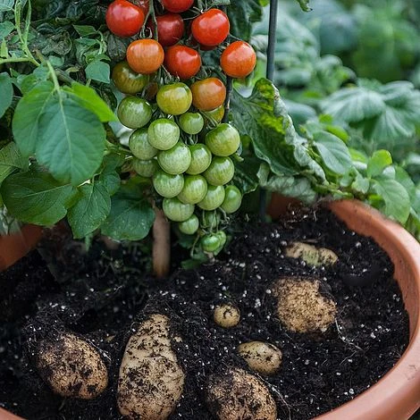 TomTato® plants can sometimes produce potato foliage from the base of the plants which may grow through the tomato foliage. These can be removed by pinching out to ground level and will not affect the potato harvest. If however this is left to grow through the tomato foliage, any potato flowers should be removed. Top up the compost in containers every so often to prevent potatoes near the soil surface from becoming green and inedible.