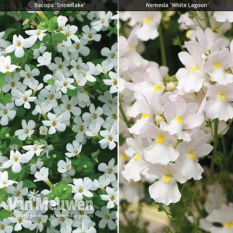 Two reliable summer-flowering annuals, bearing an abundance of pretty, pure-white flowers. Bacopa ‘Snowflake’ has a neat trailing habit, ideal for spilling over the sides of containers. Nemesia ‘White Lagoon’ has an upright, bushy habit ideal for filling containers and beds. Both varieties look superb added to mixed hanging baskets, window boxes and patio containers or grow them together for a classic, elegant display. Supplied as plug plants.